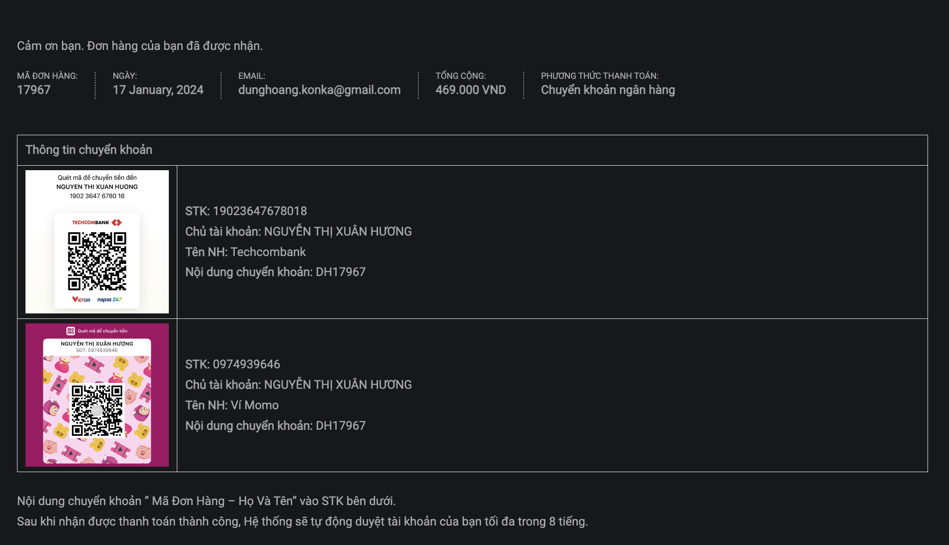 - Sau khi “ĐẶT HÀNG” hệ thống sẽ thông báo nội dung đơn hàng bạn đã đặt và thông tin chuyển khoản của NGUYỄN THỊ XUÂN HƯƠNG để bạn chuyển khoản.